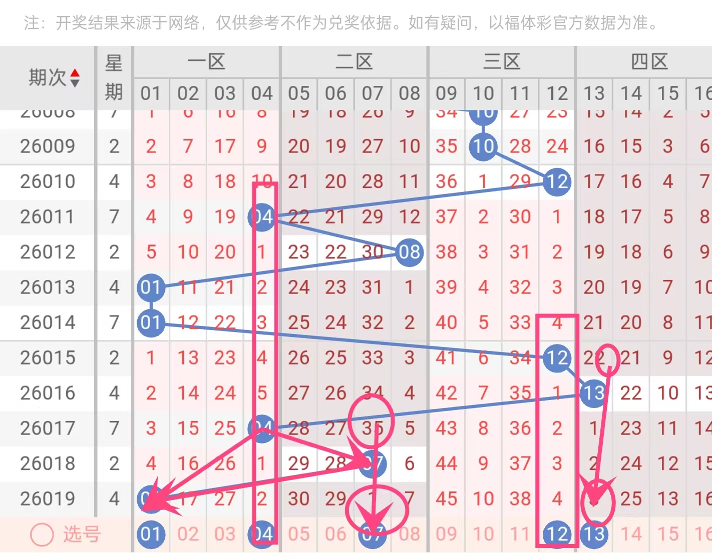 冷热转换:01为近5期开出号,但此前为冷号,有回补后走热的可能;04为隔期号(2026017期开出),近期有重号趋势;07为近5期开出号(2026018期),热度持续;12、13为温号,近期出现频率适中,有开出机会。