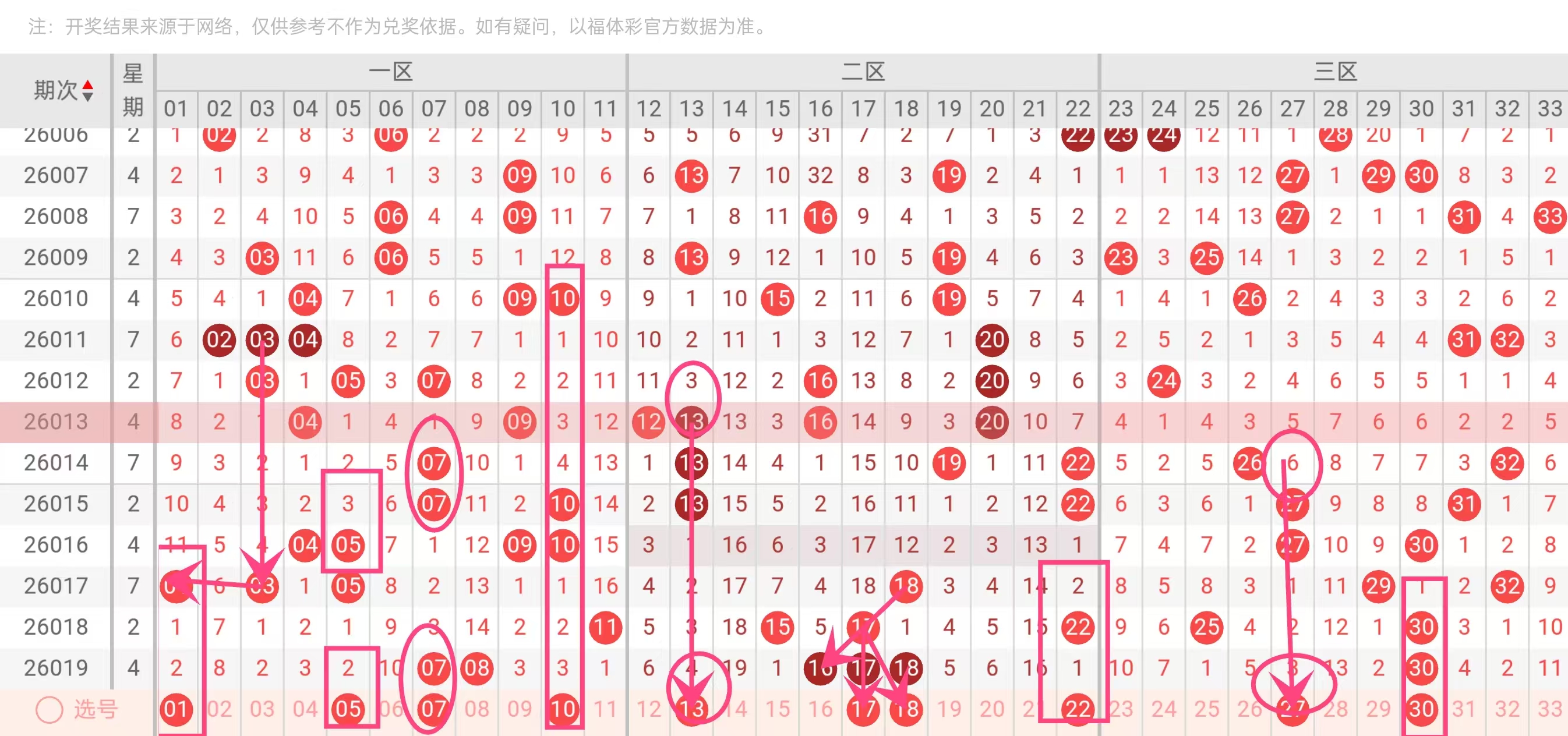 区间分布:一区(01-11)近5期出球稳定,每期2-3个,推荐01、05、07、10。01为近期冷号回补(2026017期开出),05、07为重号,10为隔期号(2026015期开出)。二区(12-22)近期偏冷,但17、18、22均为热号或重号,有望带动二区回暖。三区(23-33)近5期每期2个,推荐27、30,27为重号,30为超级热号。
