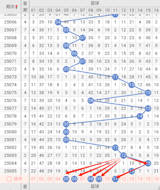 根据走势图近10期的走势看,蓝球在065期开出11蓝球之后,7小3大1小2大3小4大,再看下近10期的蓝球冷码有回补的趋势,这种趋势规律本期判断极有可能开出小号,本期防蓝球11大号,蓝球本期重点关注05,06,08,09