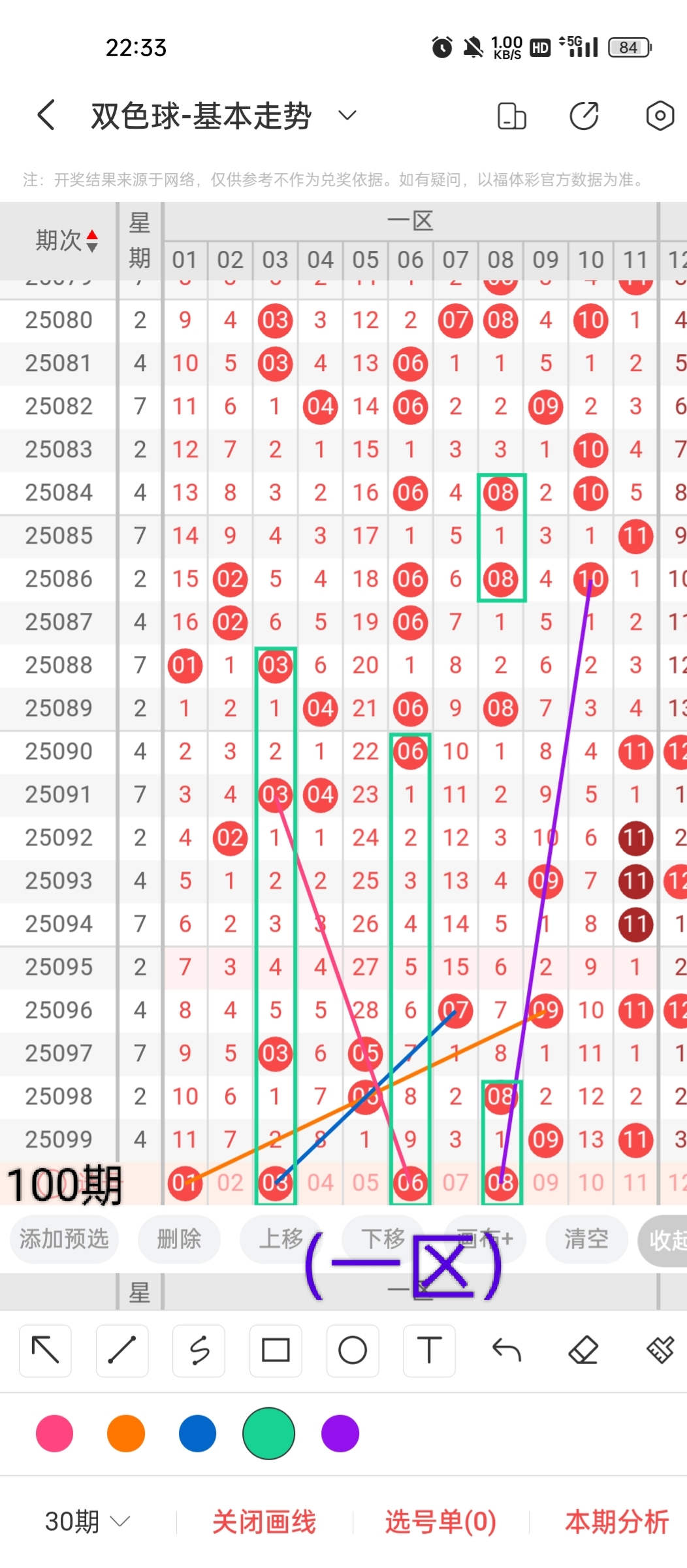 通过以上对上期的简单回顾,下面进入双色球第2025100期(下面简称本期)的选号分析:
