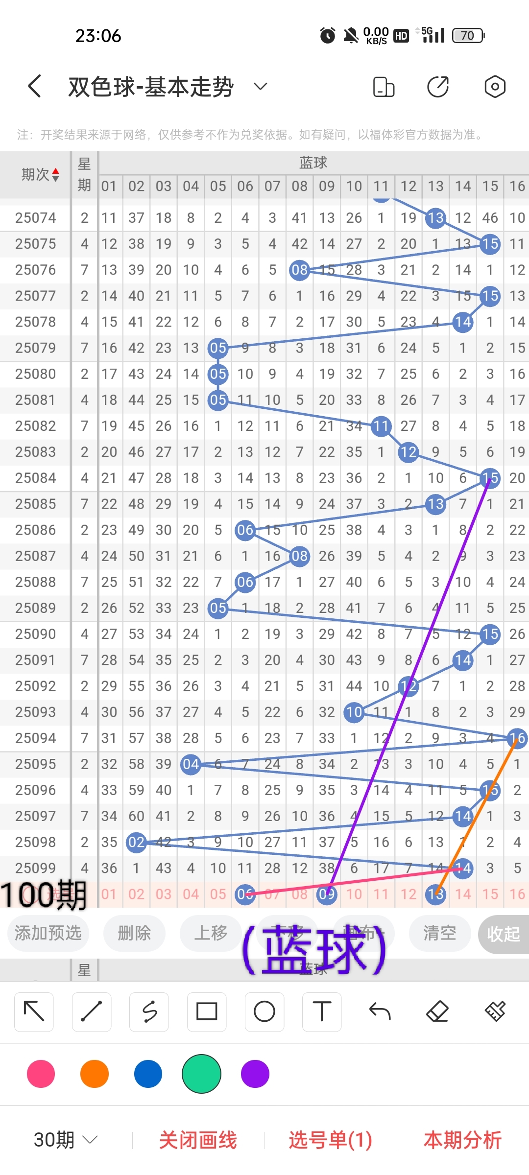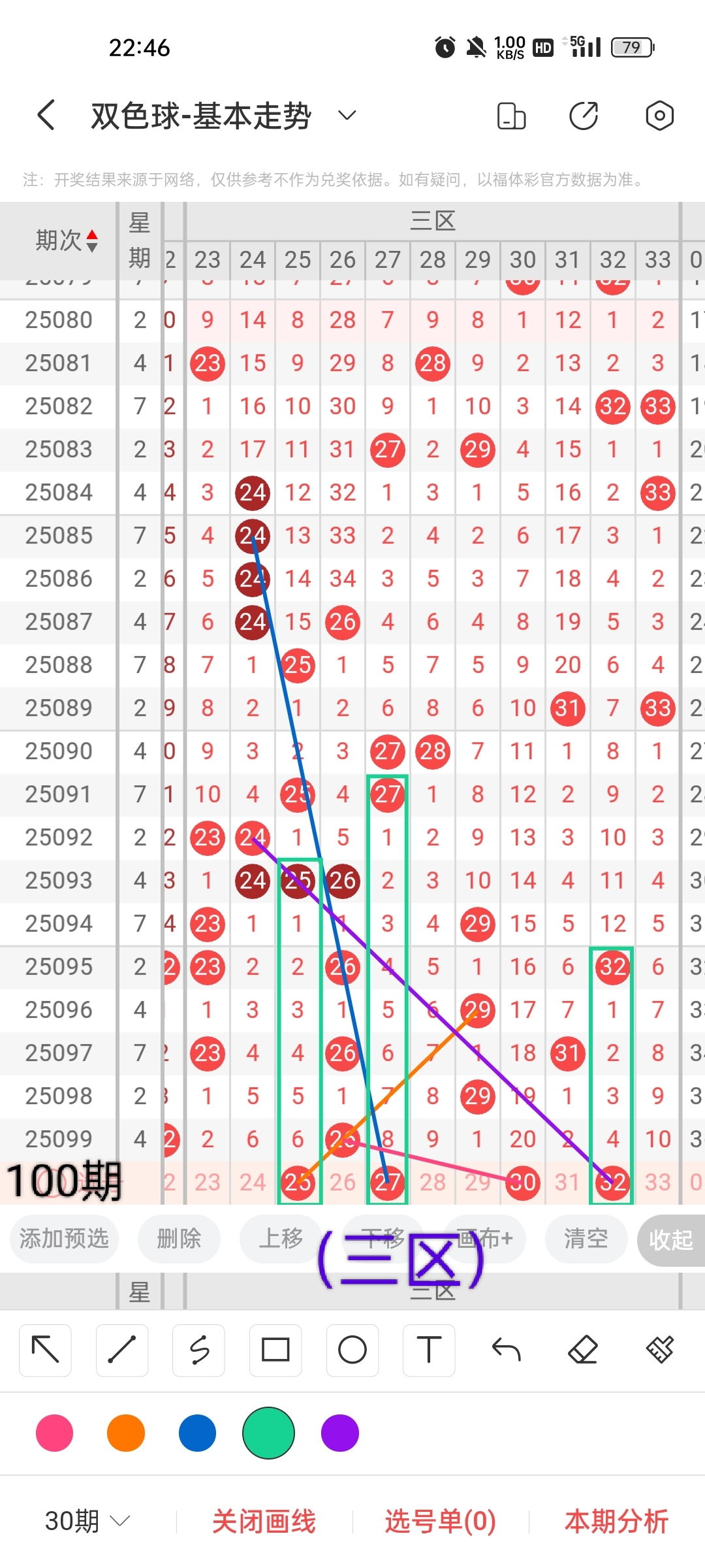 小梁根据图中画线思路,最后给大家汇总提供一下本期红球、蓝球数据,供大家参考: