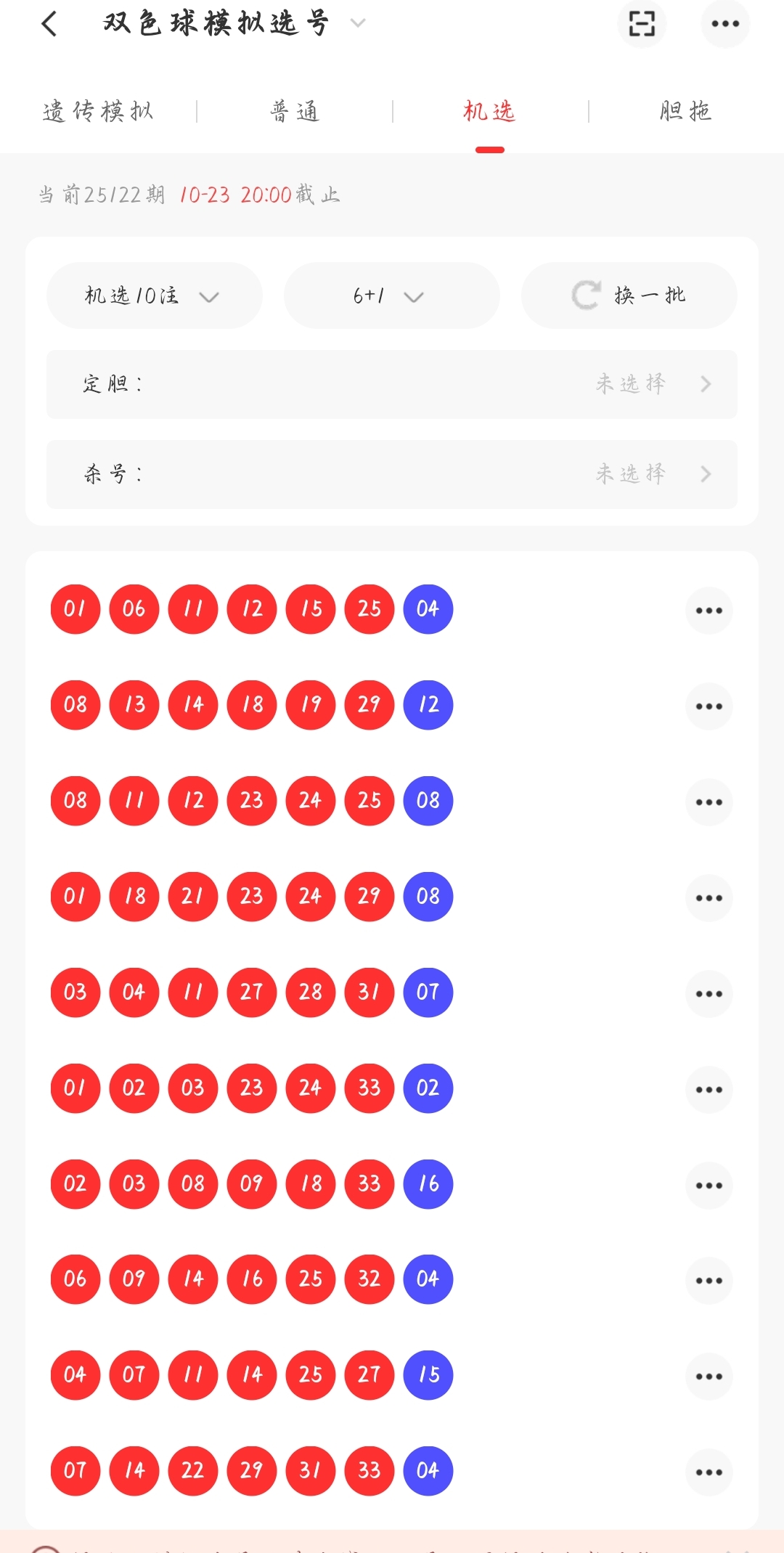 路径就是彩虹软件里面的模拟选好功能,然后选择机选,机选10注,这样我们就会得到一组10注的号码,我们需要大量的10注号码然后进行统计,我这里的选择是蓝码选择3组25注的统计,3组50注的统计,红码选择的是3组25注的统计,然后对数据进行对比研究,可以查看统计的情况记录,如下图(关注必杀蓝码重点:连续的组数据进行从下面开始网上开始10个码,然后通过两两对比,得出相同出号的作为选码,如果超过了5个号码就人工的筛选杀号,凑到5码均可,这里有一个重点就是每一组数据都是通过上面截图的办法出来的25组单注,然后通过3次25组单注的合计出来一组蓝码,通过这样的方式出来的选号,准确率尚且较高,可以有不少的参考价值)