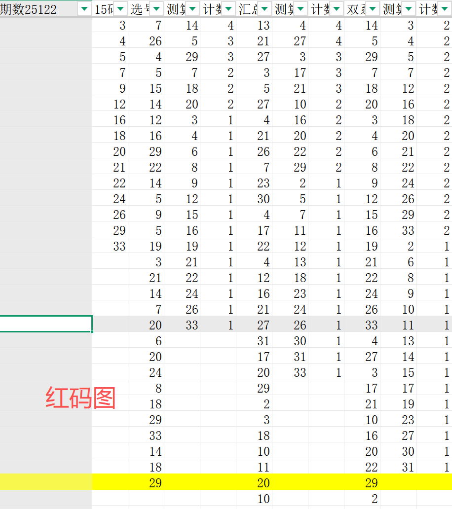 得出一组红码数据就是:3 4 5 7 9 12 16 18 20 21 22 24 26 29 33