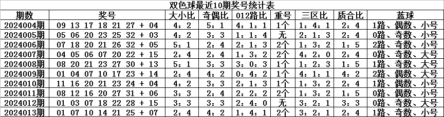双色球第2024013期开出奖号为:01、07、10、14、21、25+07,其中红球号码奇偶比为4:2,大小比为2:4,012路比为1:4:1,和值为78,跨度为24,三区比为3:2:1,开出2个重复红球:01、07。蓝球开出奇数、小号、1路。