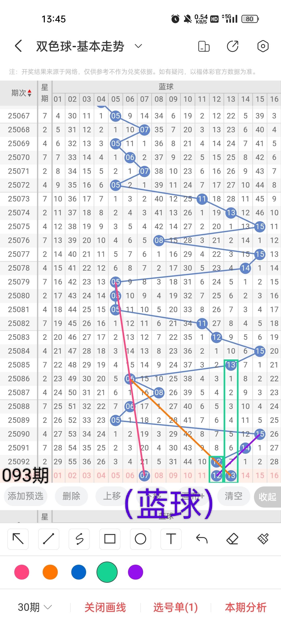 小梁根据图中画线思路,最后给大家汇总提供一下本期红球、蓝球数据,供大家参考: