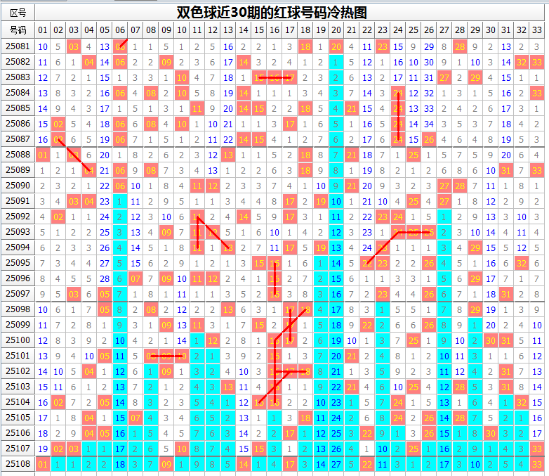 上期热、温、小、大冷为3012合形态(追踪数据请参阅前面的双色球关键参数统计表)。