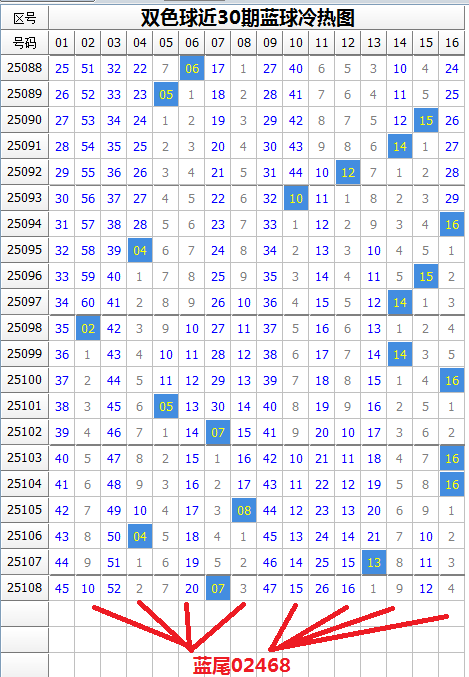 蓝球本期有热蓝7枚,冷蓝9枚,蓝球冷码数量稍多。上期开出热蓝,由于近期蓝球冷热交替开出规律不明显,本期蓝球冷热难定。