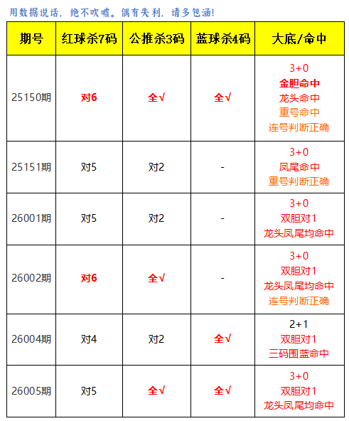 上期红球杀7码对5,公推杀3码全对,蓝球杀号全对。