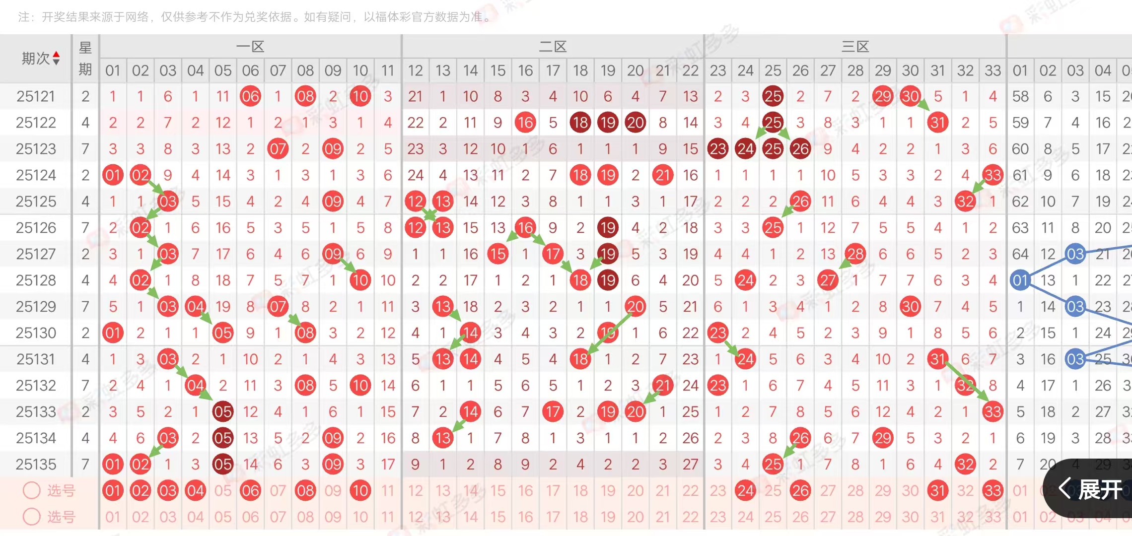 (三区:一区1-11,二区12-22,三区23-33)上期三区比4:0:2