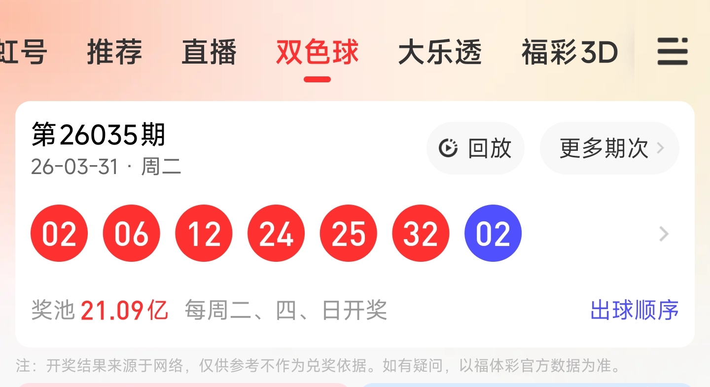 红球开出2,6,12,14,25,32,蓝球开出2。