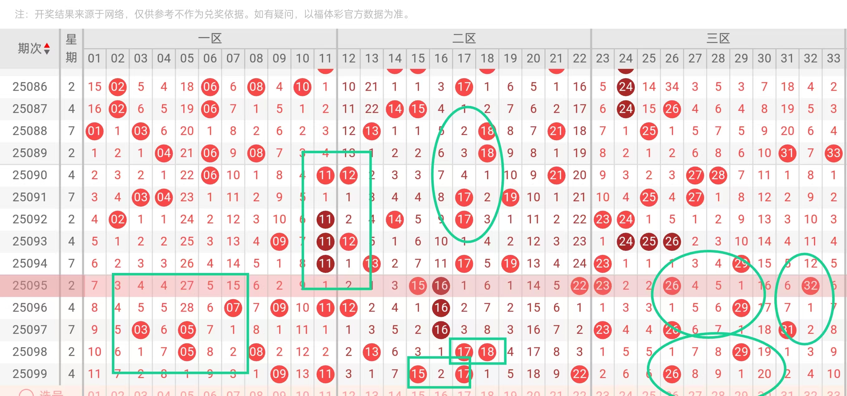 建议:继续关注二区和三区的号码,尤其是23–30之间。