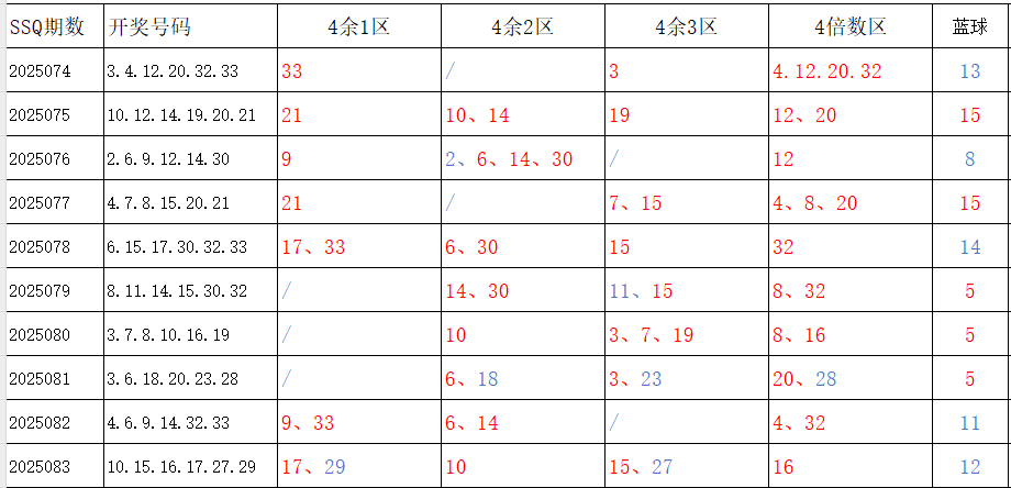 分享第一个数据分析:四分区统计数据。相对于传统的三分区,个人习惯使用四分区,就是把33个红球号码除以4,所得的余数分区如下:
