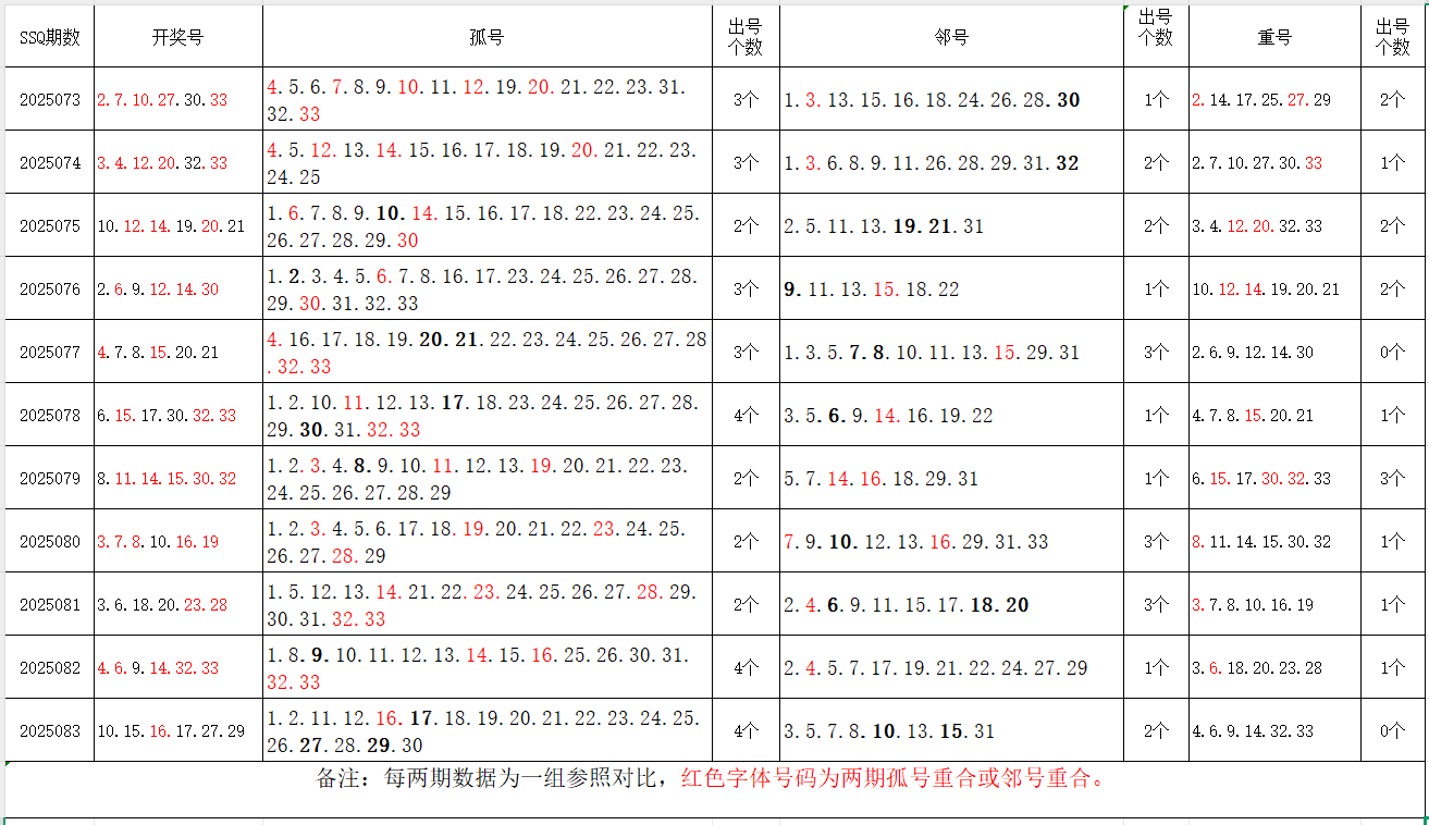 如图,以近两期数据为一组,进行对比分析。相同的孤号、邻号,可能在下期出1-4个左右。上期孤号开出4个,邻号开出2个,重号0个。本期参考孤号:1.2.3.4.5.6.7.8.12.13.19.20.21.22.23.24.25.31.32.33;邻号:9.11.14.18.26.28.30。孤、邻号重合号码精选:***(会员专区可见)。个人分析,仅供参考。