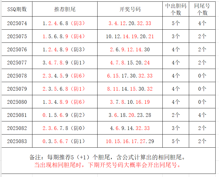 分享第三个数据分析:定胆尾。每期计算出5个推荐胆尾,加推1个重点胆尾(会员专区可见)。以近期推荐胆尾的统计数据为例: