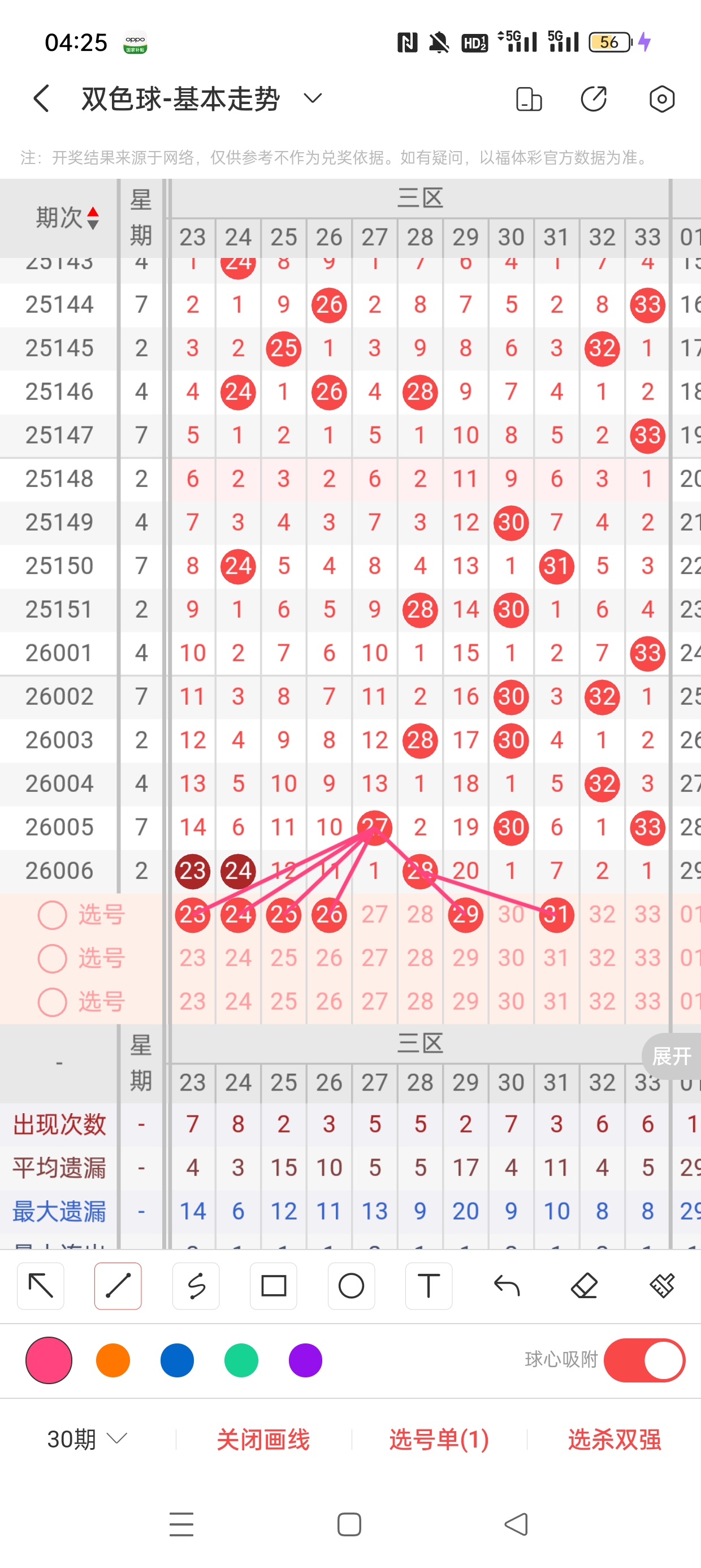 三区(23-33)近11期本区邻孤传6邻5孤0传,孤号热度高,本期着重邻传。近11期本区012路6:0:5,0/2路热度高,本着重1路。23、24作为传号,25、26分别遗漏12期、11期,四者与27之间呈现向左遗漏递减态势,需防。29、31分别遗漏20期、7期,两者与28之间呈现向右遗漏递减态势,需防。