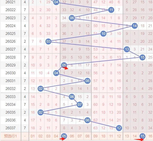 上图是福彩双色球红球号码走势图分布图,我标志出来的蓝色箭头表示4尾数数字04 14 24到本期为止4尾数数字连续遗漏了两期上次是连续遗漏了4期,那么本期4尾数数字可以关注出一个或者两个。
