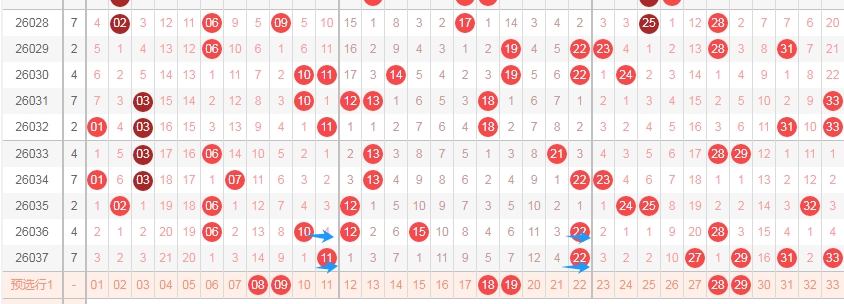 上图是福彩双色球红球号码走势图分布图,我标志出来的蓝色箭头表示上期开出的奇数数字,那么上期开出了5个奇数数字,本期继续看奇数尾数,因为前面连续两期开出的偶数多,第2026036期和第2026035期这两个出偶数出的多,假设本期继续奇数多的话,那么奇数尾数数字13579大家可以看出3个或者4个,那么可以考虑跨度二组合比如像0103 0305 0709 1719这样的双奇数的跨度二组合。同样也可以考虑出同奇数同尾数数字组合,比如0717 1727 0515 1525 0919 1929这样的同奇数同尾数组合。