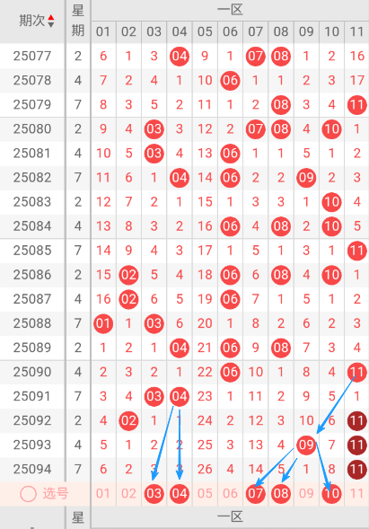 根据走势图可以看出当区段,084期开出了06.08.10三个号码球,085期开出了11一个号码球,086期开出02.06.08.10四个号码球,087期开出了02.06二个号码球,088期开出01.03二个号码球,089期开出04.06.08三个号码球,090期开出06.11四个号码球,091期开出了03.04二个号码球,093期开出了09.10二个号码球,094期开出了11一个号码球,按照如此规律本期当前区可能会开出1单或1单1双。我们看下当前区上期开出11重叠号,那么本期当前区要定重叠号的情况下可关注11号码球。再看下当前区段上期没有开出斜连号,当期选号得留意10斜连号。建议重点关注03.04.08.10