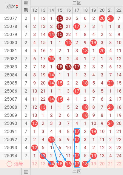 根据走势图可以看出当前区段,084期开出了14一个号码球,085期开出了14.15.18.21四个号码球,086期开出了17一个号码球 ,087期开出了14.15二个号码球,088期开出了13.18.21三个号码球,089期开出了18一个号码球,090期开出了12.21二个号码球,091期开出了17.19二个号码球,093期开出12一个号码球,094期开出13.17.19三个号码球,按照如此规律本期当前区可能开出1双1单。我们看下当前区上期没有开出重叠号,那么本期当前区要定重叠号的情况下可关注17号码球。再看下当前区上期开出12斜连号,当期选号得留意斜连16号码球。本区重点关注14.15.16.17.18