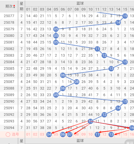 根据走势图近10期的走势看,蓝球在078期开出14蓝球之后,3小4大4小5大,再看下近10期的蓝球热码有回补的趋势,这种趋势规律本期判断极有可能开出大号,本期防蓝球03小号,蓝球本期重点关注04,06,07,11,13