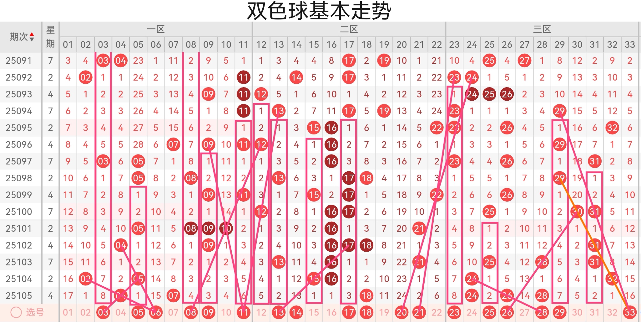 双色球第25106期基本走势分析(上期龙头正确,胆码二中一,杀八蓝正确)