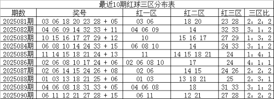 一区上期走温,出现2个奖号,近10期开出23个红球,表现非常活跃,本期预计走温,开出1-2个红球,参考号码01、10;二区上期走温,开出2个红球,近10期共开出20个红球,出号比例与理论持平,本期预计继续走温,出现1-2个红球,注意号码19、20;三区上期走温,开出2个红球,近10期共开出17个红球,走势相对较冷,本期预计继续温冷,看好号码24、28;