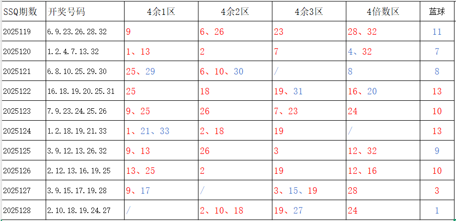 分享第一个数据分析:四分区统计数据。相对于传统的三分区,个人习惯使用四分区,就是把33个红球号码除以4,所得的余数分区如下:
