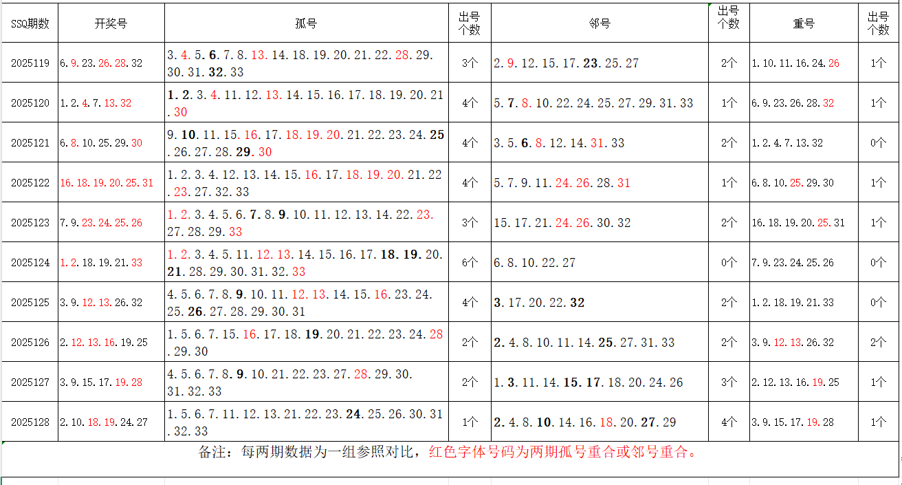 如图,以近两期数据为一组,进行对比分析。相同的孤号、邻号,可能在下期出1-4个左右。上期开出孤号1个,邻号4个,重号1个。本期参考孤号:4.5.6.7.8.12.13.14.15.16.21.22.29.30.31.32.33;邻号:1.3.9.11.17.20.23.25.26.28;孤、邻号重合号码精选:***(会员专区可见)。个人分析,仅供参考。