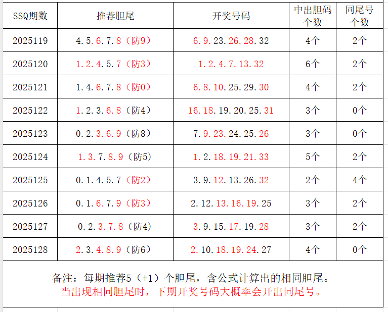 如图,每期推荐胆尾中出1-4个。上期推荐胆尾中出4尾4码!推荐胆尾是按照公式计算的顺序,不定位红球号码的顺序。本期推荐胆尾:4尾/5尾/9尾/7尾/8尾 。加推重点胆尾:***(会员专区可见)。推荐胆码号码:***(会员专区可见)。个人分析,仅供参考。