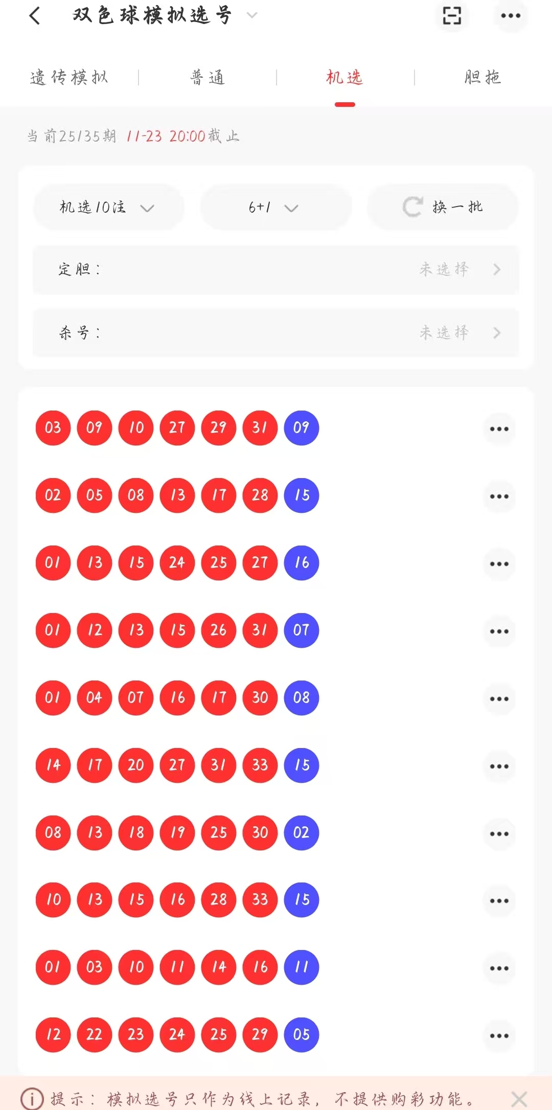 路径就是彩虹软件里面的模拟选好功能,然后选择机选,机选10注,这样我们就会得到一组10注的号码,我们需要大量的10注号码然后进行统计,我这里的选择是蓝码选择3组25注的统计,3组50注的统计,红码选择的是3组25注的统计,然后对数据进行对比研究,可以查看统计的情况记录,如下图(关注必杀蓝码重点:连续的组数据进行从下面开始网上开始10个码,然后通过两两对比,得出相同出号的作为选码,如果超过了5个号码就人工的筛选杀号,凑到5码均可,这里有一个重点就是每一组数据都是通过上面截图的办法出来的25组单注,然后通过3次25组单注的合计出来一组蓝码,通过这样的方式出来的选号,准确率尚且较高,可以有不少的参考价值)