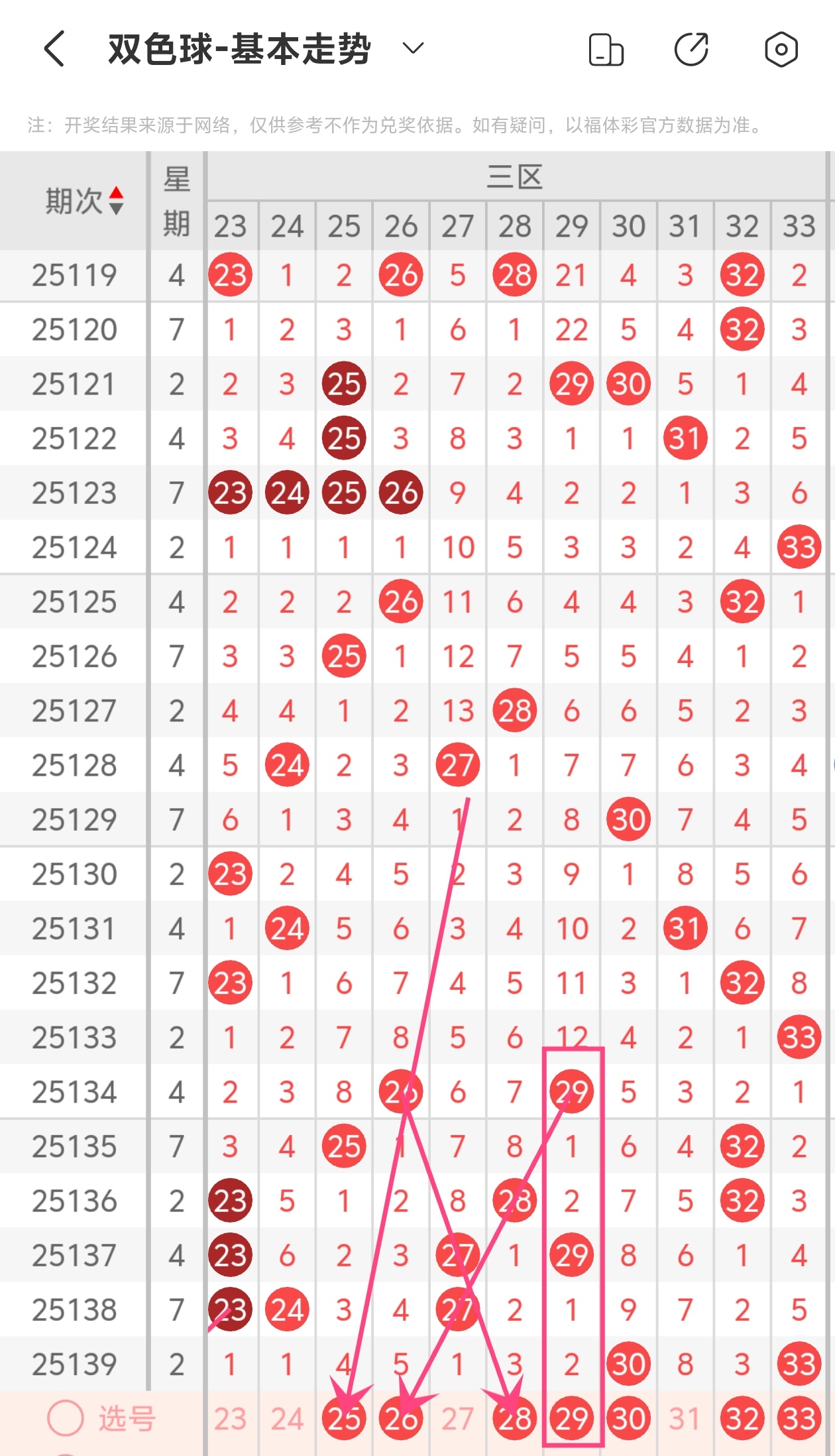 上期第三区间开出30 33,本期我们可以从上面走势图中看到选号的思路,25为斜连走势,26为斜连走势,28为斜连走势,29为对称形态,综合以上分析本期第三区间推荐25 26 28 29