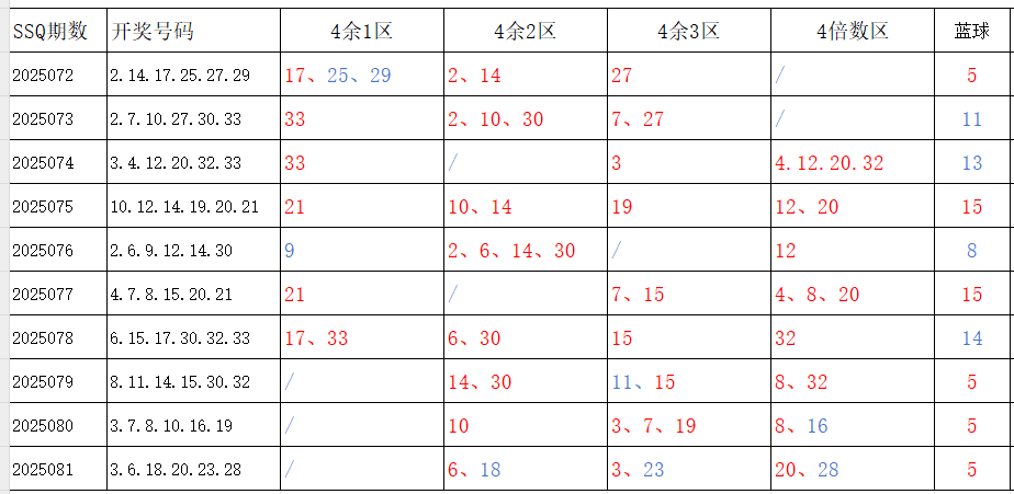 分享第一个数据分析:四分区统计数据。相对于传统的三分区,个人习惯使用四分区,就是把33个红球号码除以4,所得的余数分区如下: