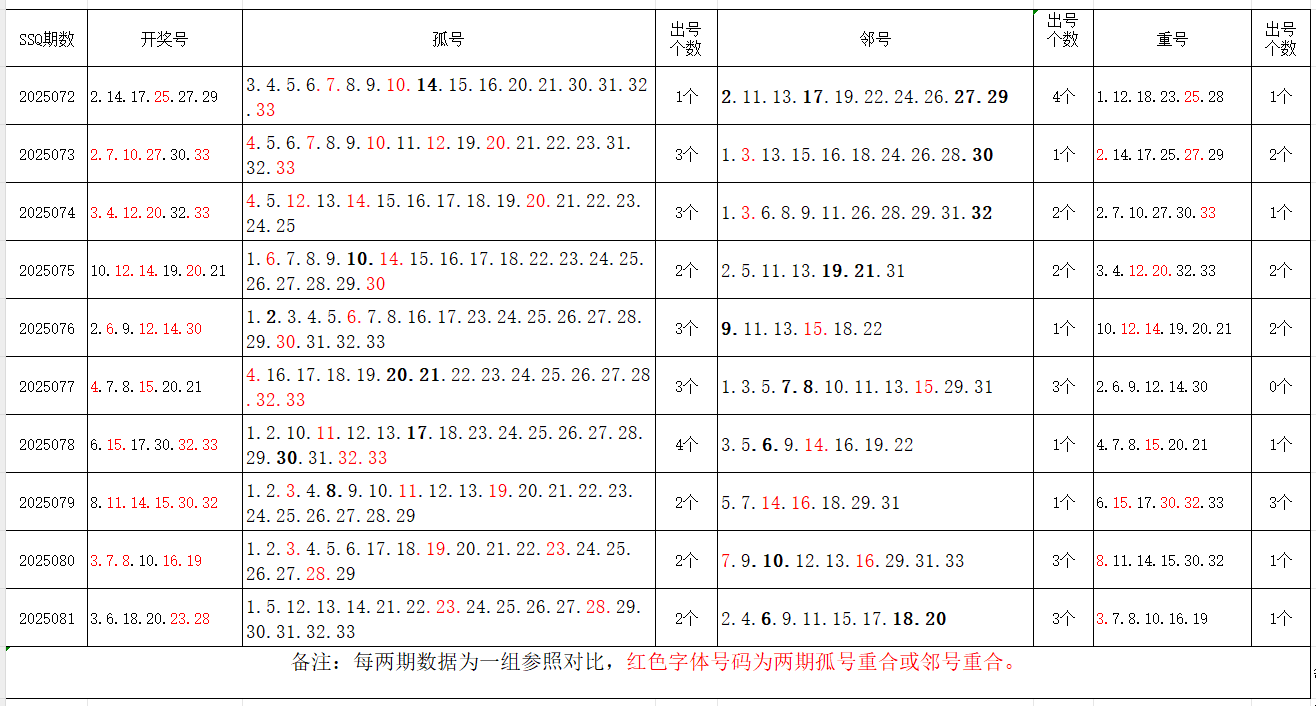 如图,以近两期数据为一组,进行对比分析。相同的孤号、邻号,可能在下期出1-4个左右。上期孤号开出2个,邻号开出3个,重号1个。本期参考孤号:1.8.9.10.11.12.13.14.15.16.25.26.30.31.32.33;邻号:2.4.5.7.17.19.21.22.24.27.29。孤、邻号重合号码精选:***(会员专区可见)。个人分析,仅供参考。