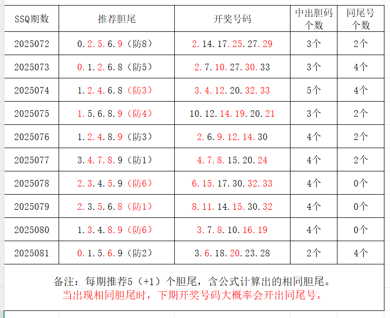 如图,每期推荐胆尾中出1-4个。上期推荐胆尾中出2尾2码!推荐胆尾是按照公式计算的顺序,不定位红球号码的顺序。本期推荐胆尾:8尾/3尾/2尾/6尾/7尾 。加推重点胆尾:***(会员专区可见)。推荐胆码号码:***(会员专区可见)。个人分析,仅供参考。