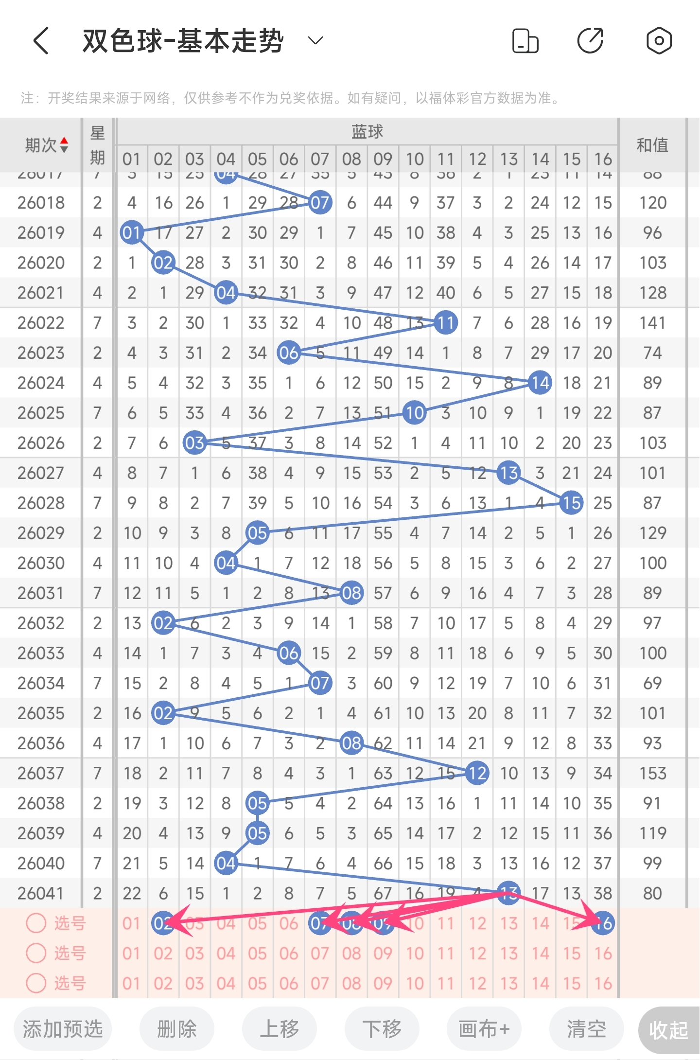 上期开出的是13,往前一期开出的是4。趋势往右移动,偏移量为9。通过分析目前蓝球的走势图,目前趋势是大概率往左,小概率往右1。从偏移量看,本期偏移量比较看好会变小一点,然后就是防突然变很小和继续变大。最后再结合遗漏期数,以及冷热号,本期我们可以关注2,7,8,9,16等号码。