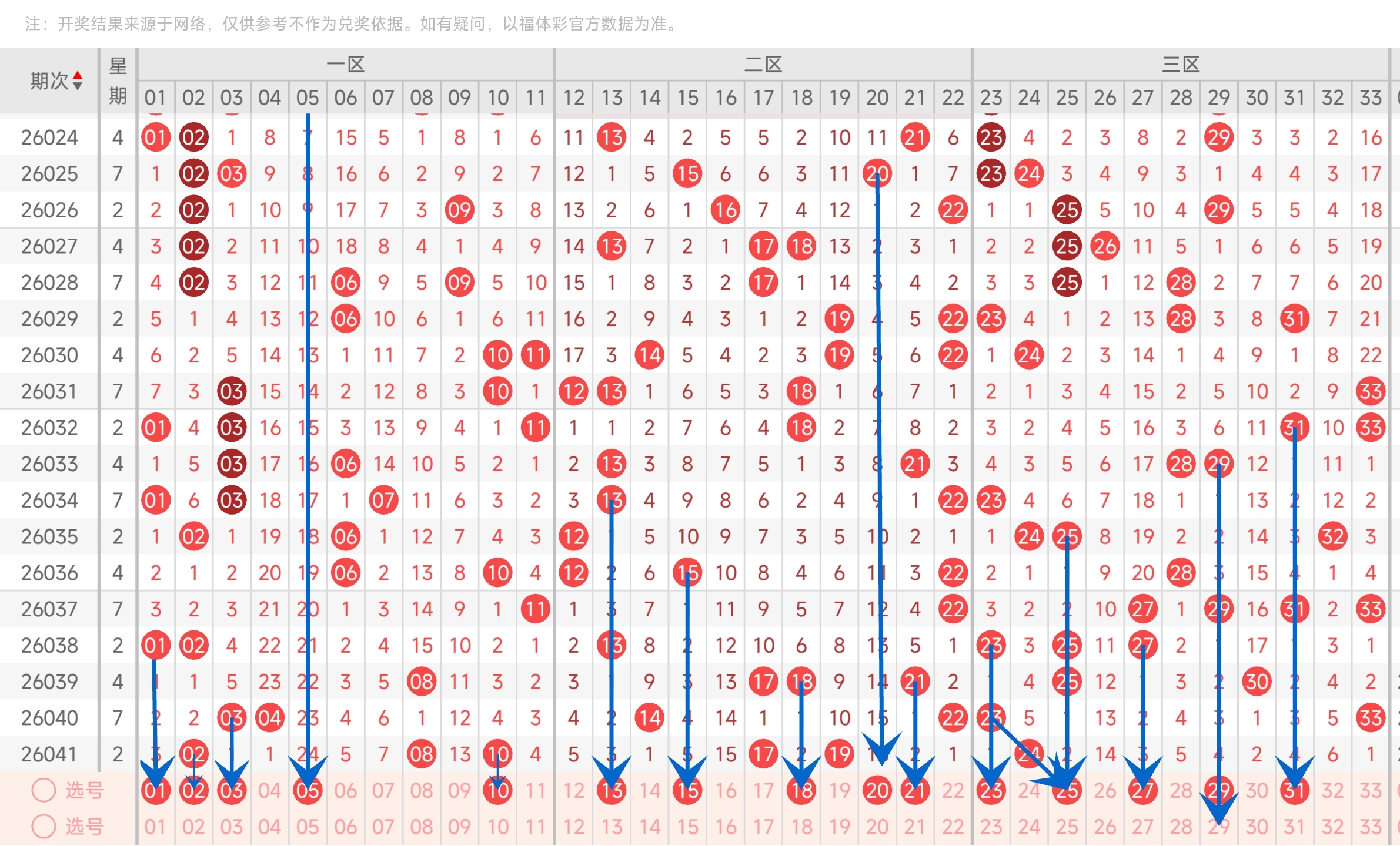 上一期三区开出了24号球。往前一期开出了23,33号球。通过走势图分析,可以看到上期三区开了1码,本期关注1码或者2码,防3码。从最近跨度分析看,本期跨度可能会变大,我们选择凤尾就可以往右边或者中间选择,再防一下左边的。综合来看,本期可以比较均匀关注一下三区的号码。最后再结合冷热号和遗漏期数,本期我们可以关注23,25,27,29,31等号。