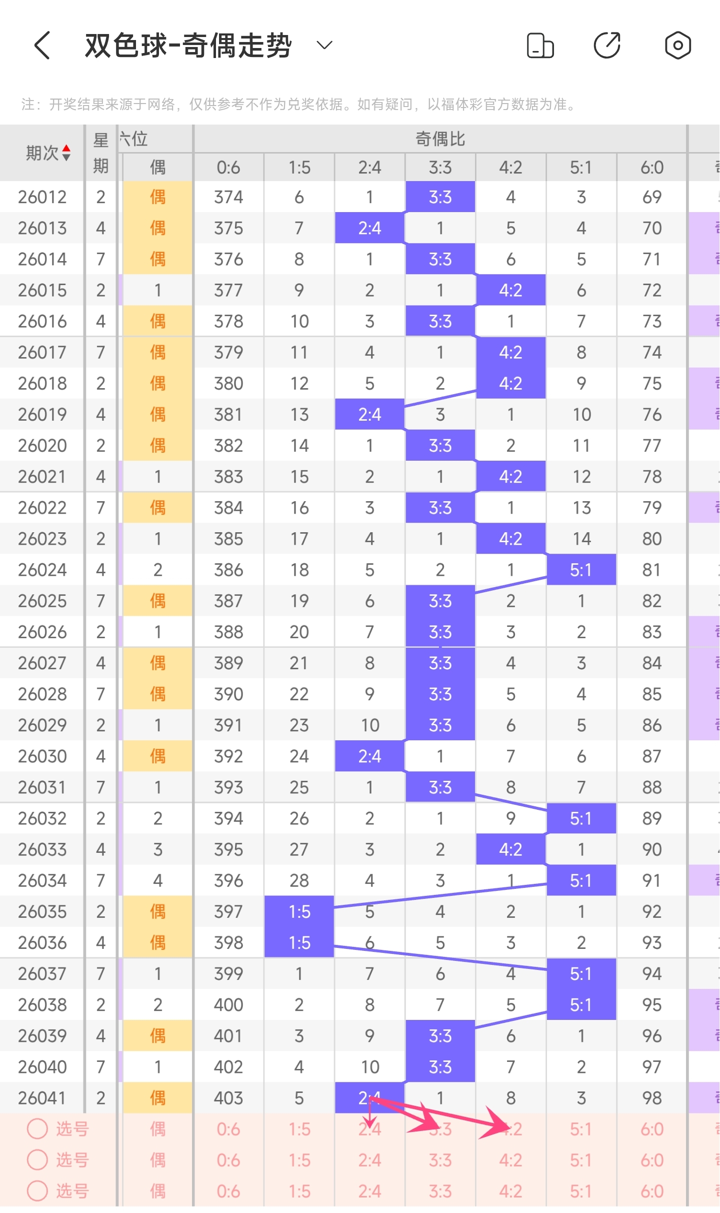 上期奇偶比为2:4,分别为偶偶偶奇奇偶。往前一期奇偶比为3:3。通过近30期内奇偶走势的数据分析,目前1:5奇偶比开出的概率是6.66%,5:1奇偶比开出的概率是16.66%,3:3奇偶比开出的概率是43.33%,4:2奇偶比开出的概率是23.33%,2:4奇偶比开出的概率是13.33%,6:0奇偶比开出的概率是0%。与前一期相比,概率没有变化。通过分析走势图,上期开了2:4奇偶比,本期有可能开4:2或者3:3奇偶比,其次是2:4奇偶比。所以本期推测本期可能开4:2奇偶比和3:3奇偶比,其次是2:4,最后是1:5和5:1奇偶比。