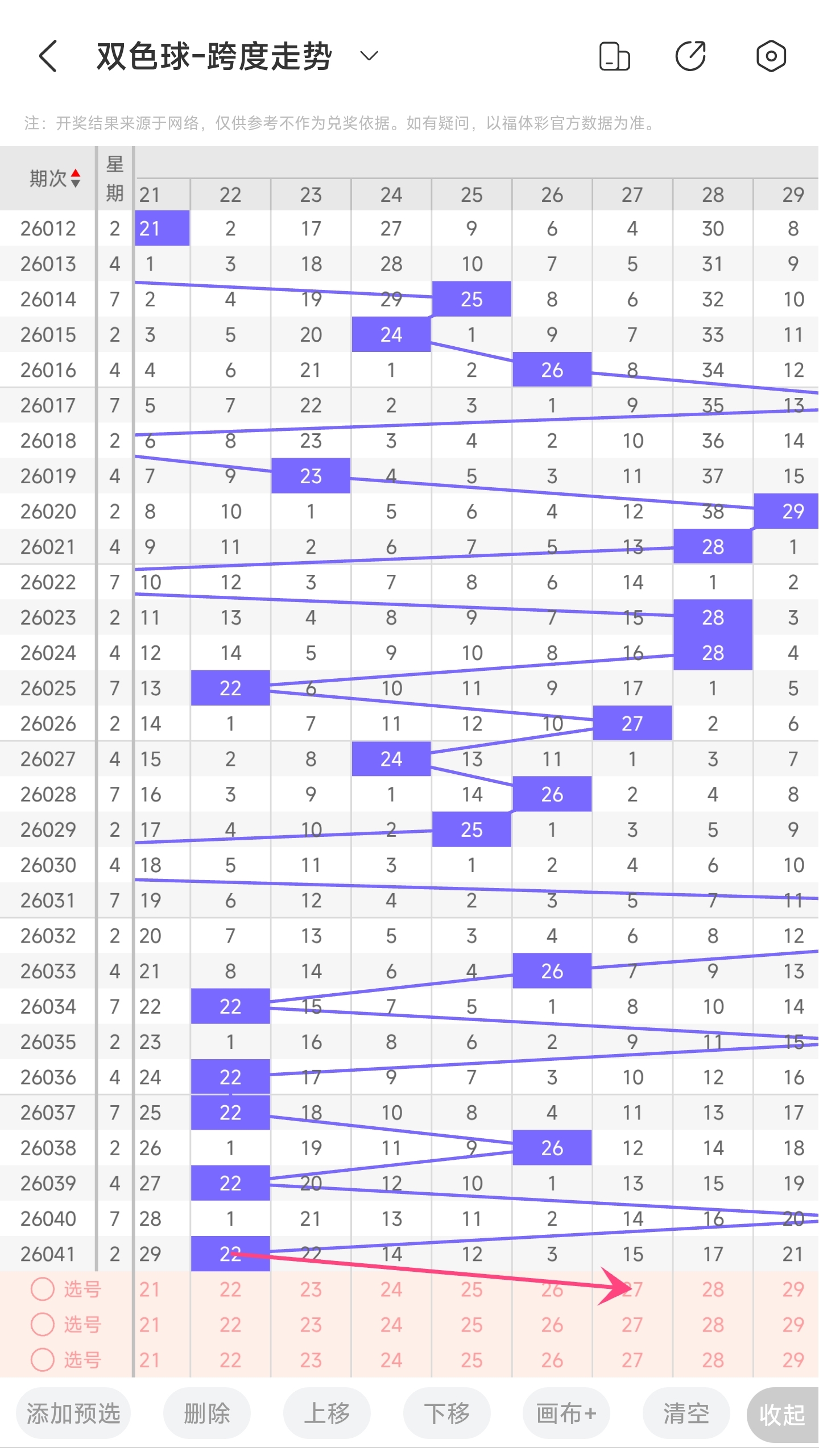 上期龙头为2,凤尾为24,跨度为22,往前一期跨度是30,偏移量为8。22跨度值是30期内开出比较小的跨度值。下降的空间比较小,上升空间比较大,根据最近龙头凤尾走势,本期跨度可能会变大,所以推测本期跨度趋势是往右的,跨度变大,小概率跨度变小。