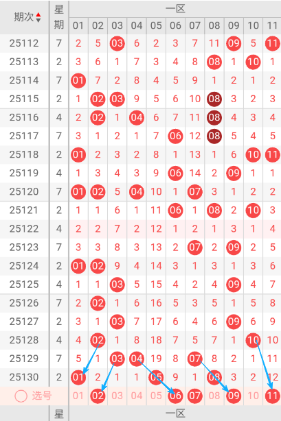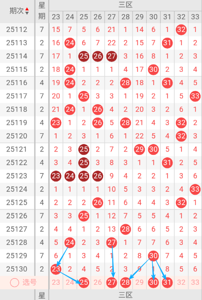 根据走势图可以看出当前区,121期开出25.29.30三个号码球 ,122期开出个25.31二号码球 ,123期开出23.24.25.26四个号码球 ,124期开出33一个号码球 ,125期开出26.32二个号码球 ,126期开出25一个号码球 ,127期开出28一个号码球 ,128期开出24.27二个号码球 ,129期开出30一个号码球 ,130期开出23一个号码球 ,按照如此规律判断本期当前区可能开出1双或2双。我们看下当前区上期没有开出重叠号,那么本期当前区要定重叠号的情况下可关注23码球。再看下当前区上期没有开出斜连号,当期选号得留意24斜连号。本区重点关注25.27.28.30.31