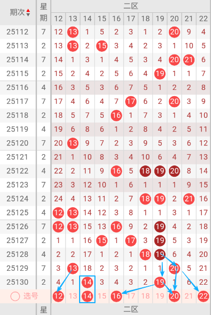 根据走势图可以看出当前区段,121期没有开出号码球 ,122期开出个16.18.19.20四个号码球 ,123期没有开出号码球 ,124期开出个18.19.21三号码球 ,125期开出12.13二个号码球 ,126期开出12.13.16.19四个号码球 ,127期开出15.17.19三个号码球 ,128期开出18.19二个号码球 ,129期开出13.20二个号码球 ,130期开出14.19二个号码球 ,按照如此规律本期当前区可能开出2双或1单1双。我们看下当前区上期没有开出重叠号,那么本期当前区要定重叠号的情况下可关注14号码球。再看下当前区上期开出19斜连号,当期选号得留意斜连20号码球。本区重点关注12.14.16.20.22