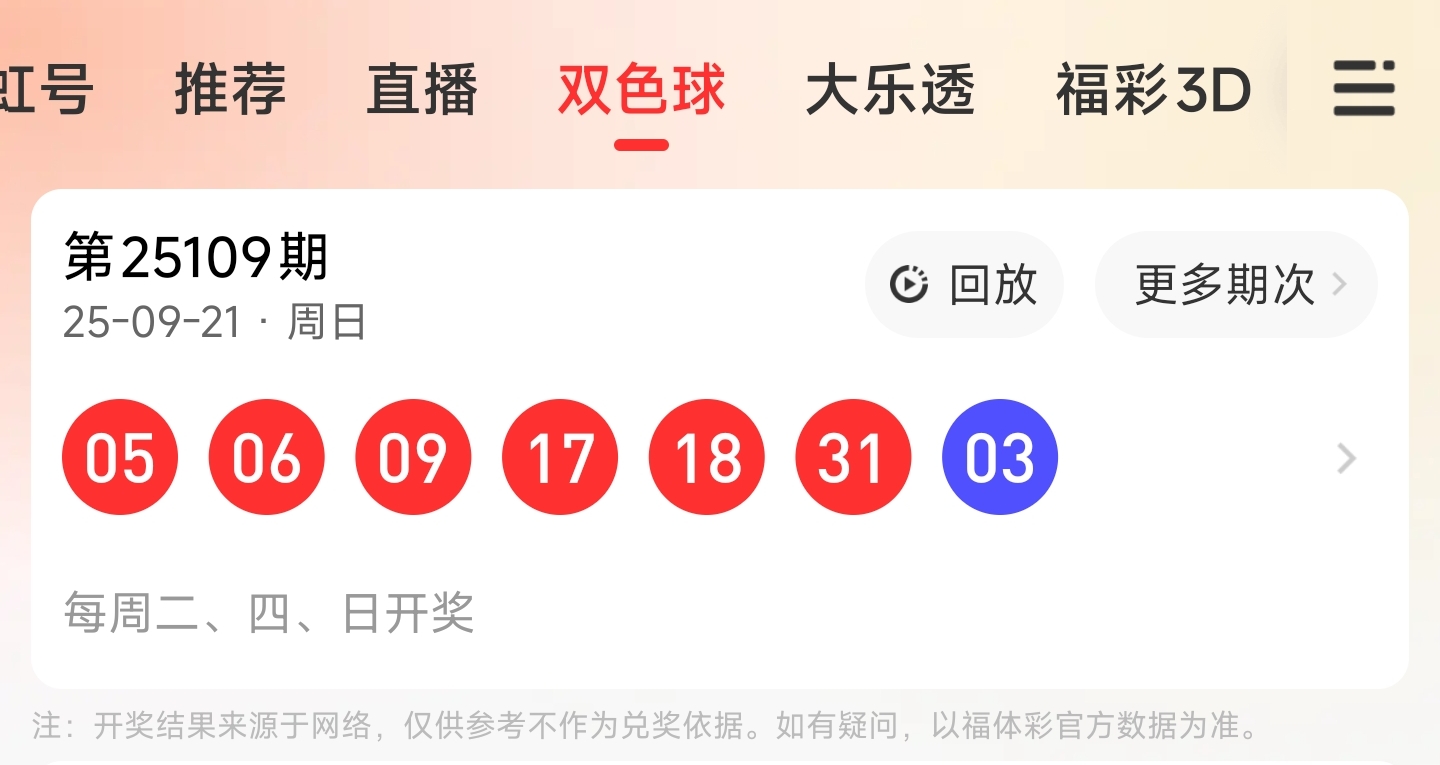 第25109期双色球文章中推荐中命中06,17,31等3个红球,命中蓝球03。