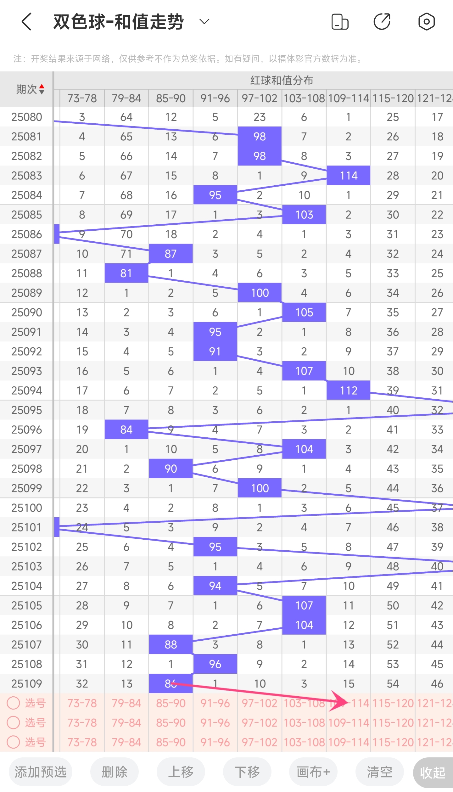上期和值为86,而近5期和值为94,107,104,88,96,86均值88.8,上期和值较前一期减少了10,振幅为10。86和值是属于近30期内开出的中间偏小的和值,下降的的空间要比上升的空间小一点,本期更看好大和值。所以推测本期和值趋势是大概率会往右上升,和值变大,小概率继续往左,和值变小。