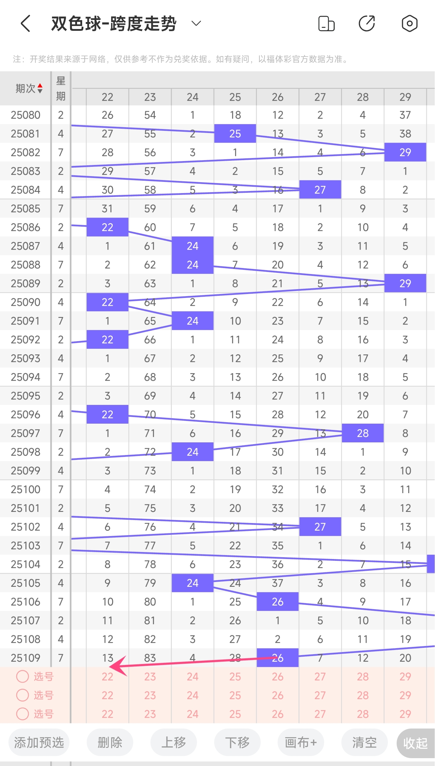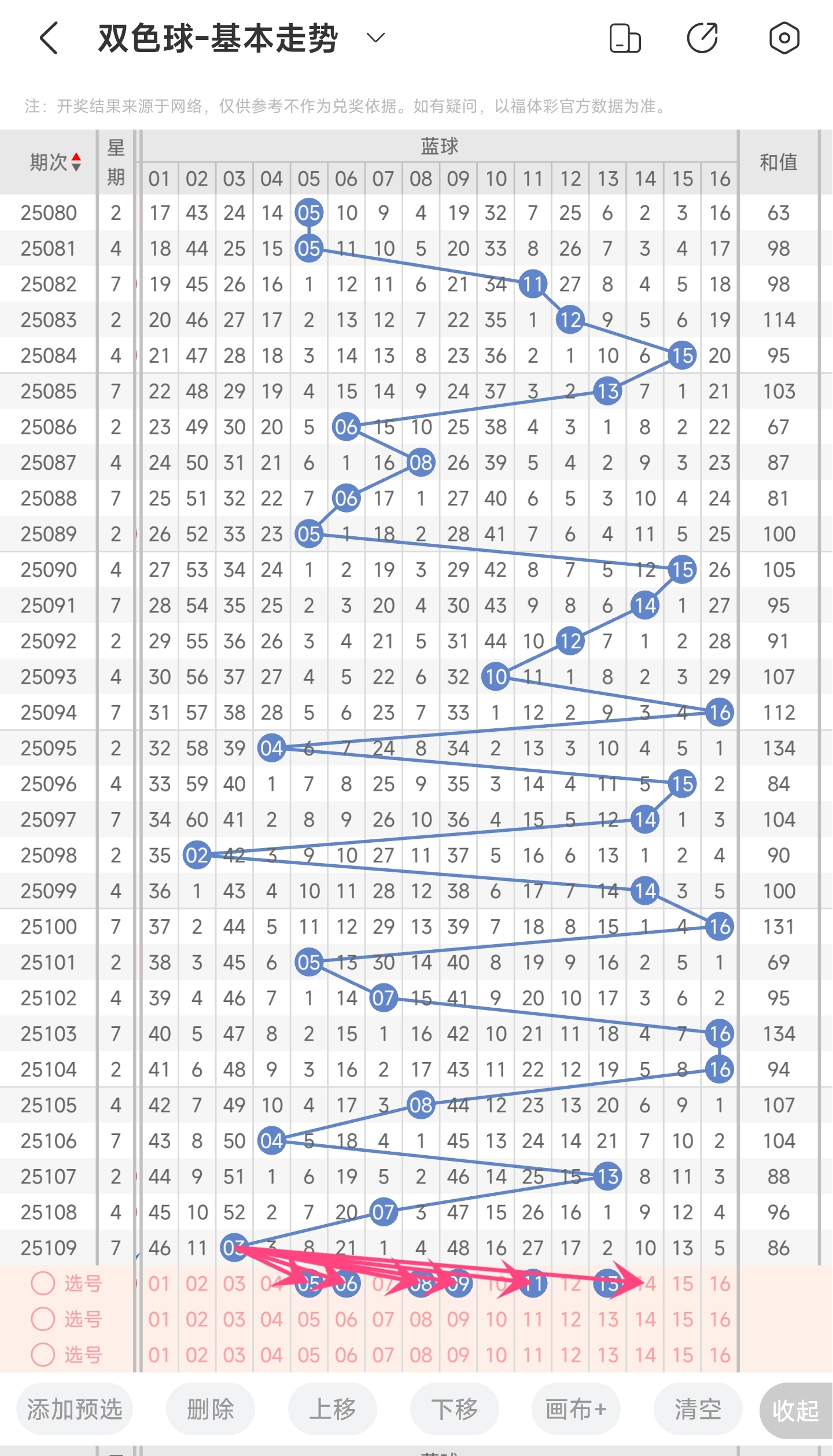上期龙头为05,凤尾为31,跨度为26,往前一期跨度是32,偏移量为6。16跨度值是30期内开出的偏大的跨度值。上升的空间比较小,下降空间比较大,所以推测本期跨度有较大可能是跨度变小,趋势往左,小概率折返往右,跨度变大。
