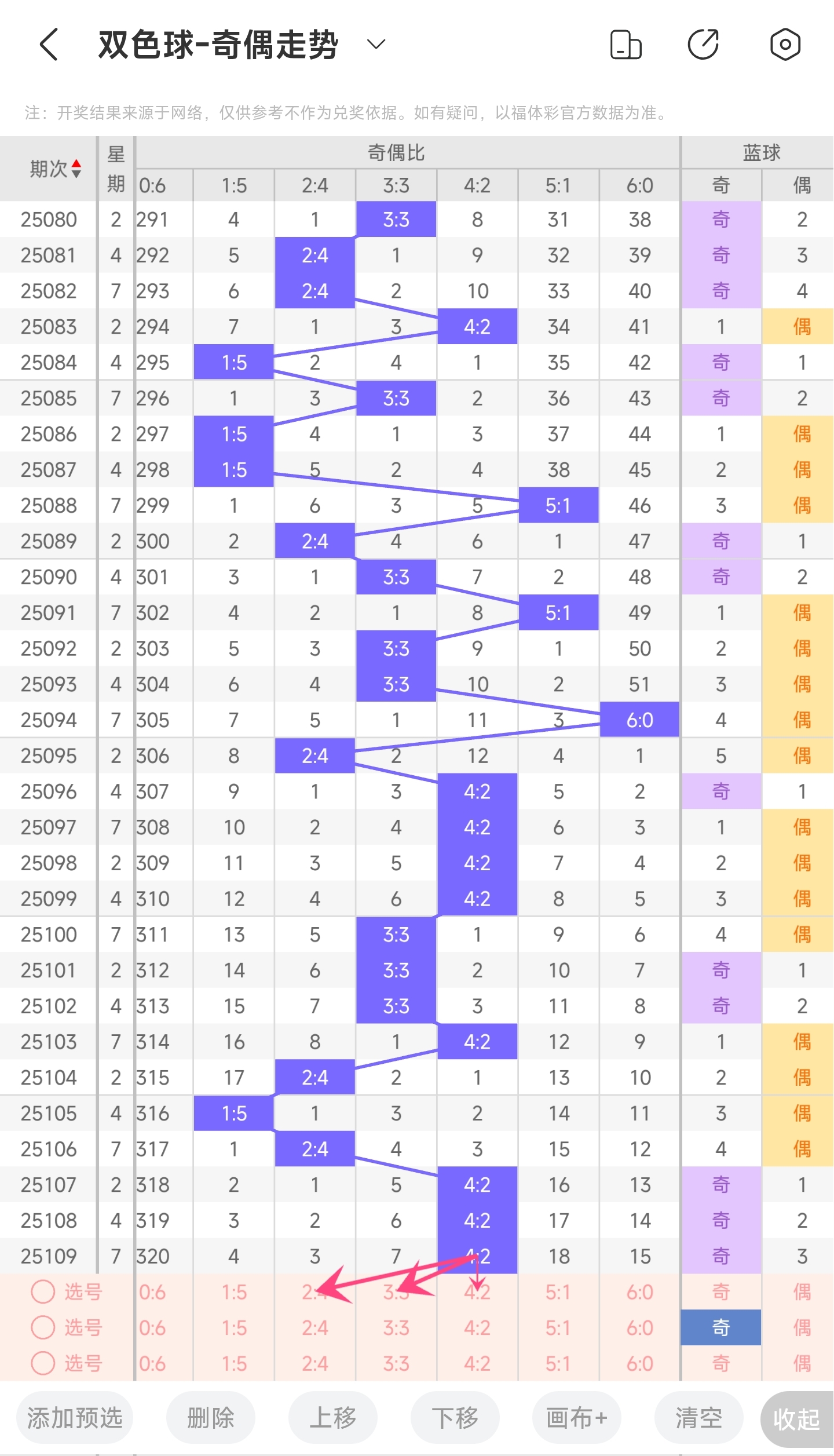 上期奇偶比为4:2,分别为奇偶奇奇偶奇。往前一期奇偶比为4:2。通过近30期内奇偶走势的数据分析,目前1:5奇偶比开出的概率是13.33%,5:1奇偶比开出的概率是6.66%,3:3奇偶比开出的概率是26.66%,4:2奇偶比开出的概率是30%,2:4奇偶比开出的概率是20%,6:0奇偶比开出的概率是3.33%。与前一期相比,4:2奇偶比概率变大了,2:4奇偶比概率变小了。通过分析走势图,4:2奇偶比已经连续开出3期了,继续开出的概率是大大降低的了,比较大概率会开其它类型。所以推测大概率可能会开3:3或者2:4奇偶比,当然也有可能性会继续开4:2奇偶比,更小的概率可能会开1:5或者5:1奇偶比。