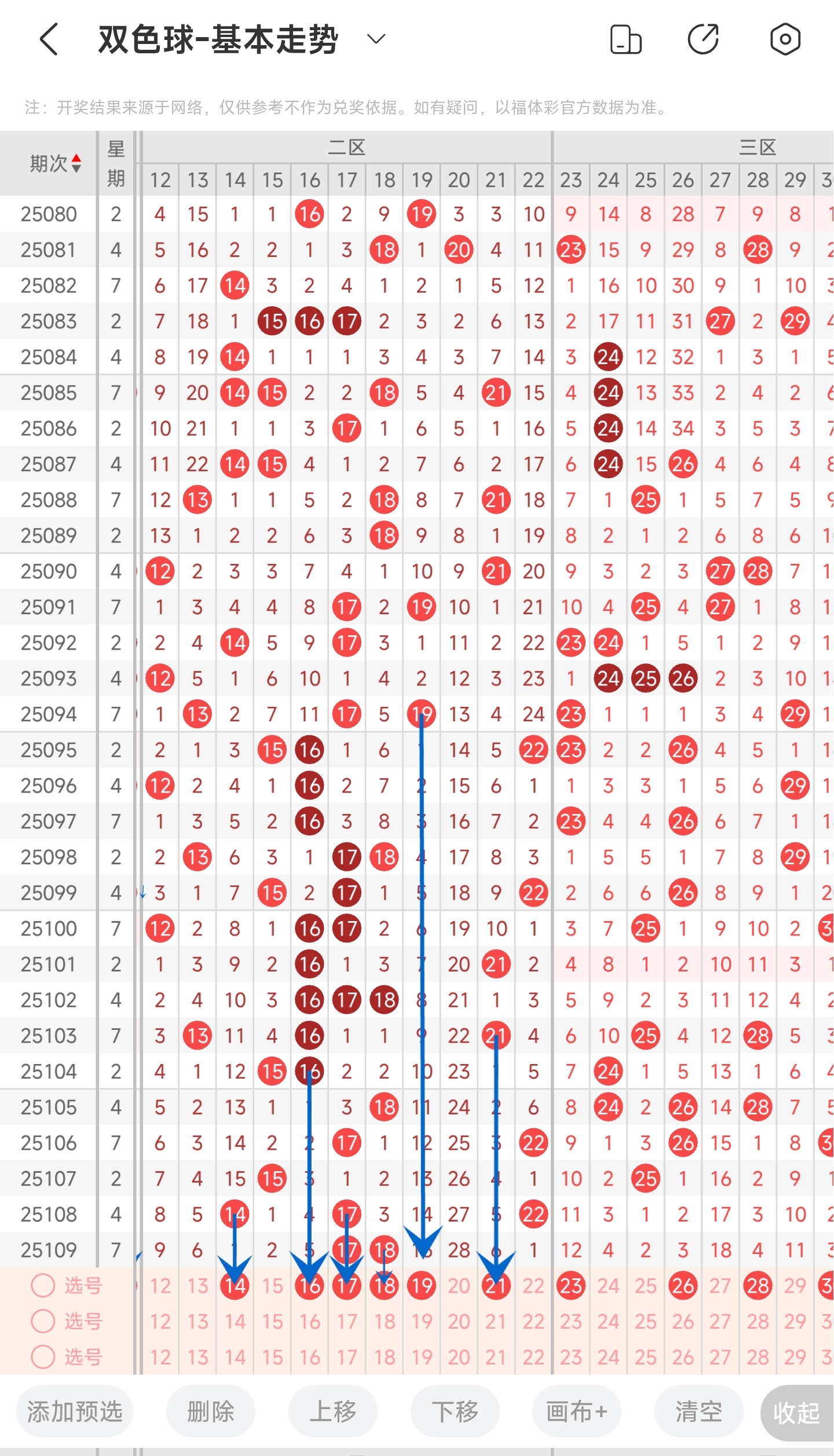 上一期二区开出了17,18等号码。往前一期开出了14,17,22。通过分析走势图,我们也可以看到二区中间的号码也是一样的热门,所以本期也仍有较大的可能性会开出,因此我们要重点关注中间的号码,再以此为基础向左右两边扩散兼顾一下其它号码。最后结合冷热号和遗漏期数,本期我们可以关注一下14,16,17,18,19,21等号码。综上所述推测本期可能开14,16,17,18,19,21等号码。