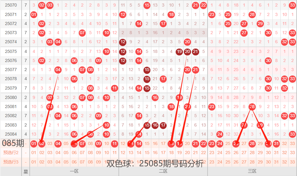 先介绍下上期开奖号码的基本情况,红球奇偶比:1:5,区间比:3:1:2,012路比:3:1:2,通过上期号码简单介绍,分享下25085期号码球个人认为的出号可能,供大家参考!