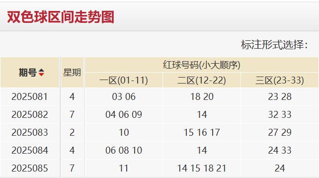 近五期一区号码数量为2+3+1+3+1=10枚,整体占比为33.3%;二区号码数量为2+1+3+1+4=11枚,整体占比为36.7%;三区号码数量为2+2+2+2+1=9枚,整体占比为30%。一区占比处于均值,呈现下降趋势,鉴于整体波动,本期重点关注。二区占比最大,周期内波动剧烈,本期倾向于下调。三区持续稳定,本期倾向于回调。基于波动趋势衡量以及动态平衡干预,本期区间比倾向于3:1:2。