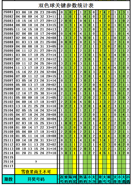 以下是作者手工统计的双色球关键参数统计表,对喜欢参数分析、过滤缩水、选号胆杀的技术性双色球爱好者有所帮助,其它读者可略过不看。