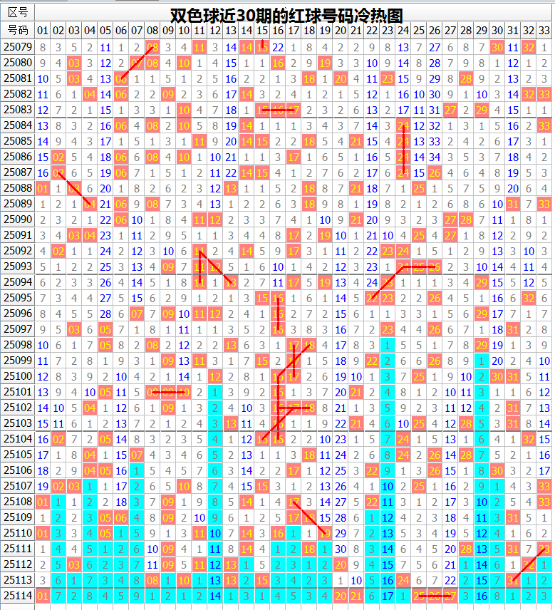 双色球近30期的红球号码冷热图 (数字为遗漏期数,蓝色标记的为遗漏超过10期的大冷号)
