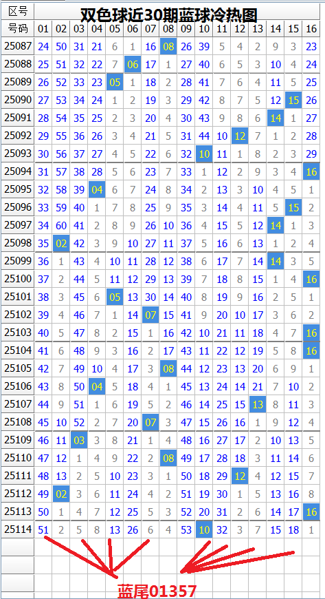 蓝球本期有热蓝9枚,冷蓝7枚,蓝球热码数量稍多。上期开出冷蓝,由于近期蓝球冷热交替开出规律不明显,本期蓝球冷热难定。